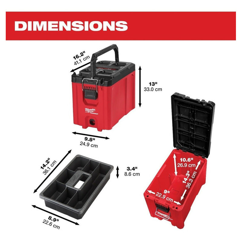La caja para herramientas compacta PACKOUT™ es parte del sistema de almacenamiento modular PACKOUT™ de MILWAUKEE™, el sistema de almacenamiento más duradero y versátil de la industria. La caja para herramientas compacta PACKOUT™ está fabricada con polímeros resistentes a los impactos y cuenta con una capacidad de peso de 34 kilogramos. La caja para almacenamiento de herramientas se conecta con otros componentes del sistema PACKOUT™ mediante los listones de bloqueo integrados. El sello impermeable con clasificación IP65 protege las herramientas y accesorios contra la lluvia y otros residuos del lugar de trabajo. Los divisores de ajuste rápido y una bandeja interior mantienen los equipos organizados. La caja para herramientas portátil se puede transportar fácilmente con su manilla de transporte y bisagras reforzadas. El almacenamiento modular PACKOUT™ le permite personalizar su sistema de almacenamiento para transportar y organizar fácilmente las herramientas y los accesorios.