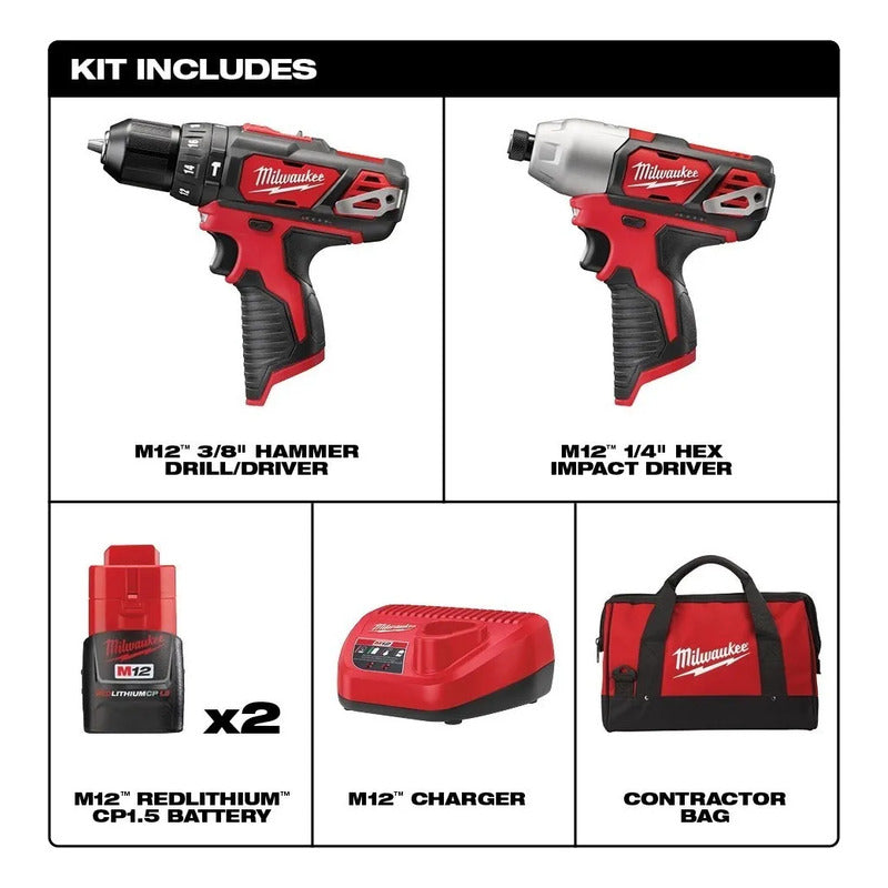 Kit Inalámbrico Rotomartillo 3/8" Llave de Impacto de 1/4" M12 con Carbones 12 Voltios 2 Baterías CP 1.5 Amp. + Cargador + Maleta de Almacenaje.